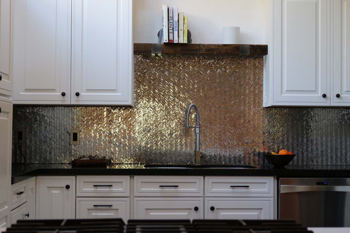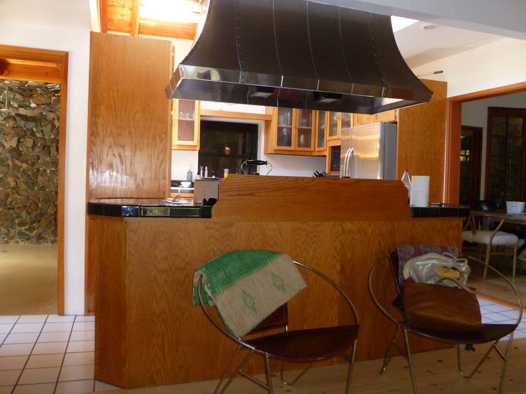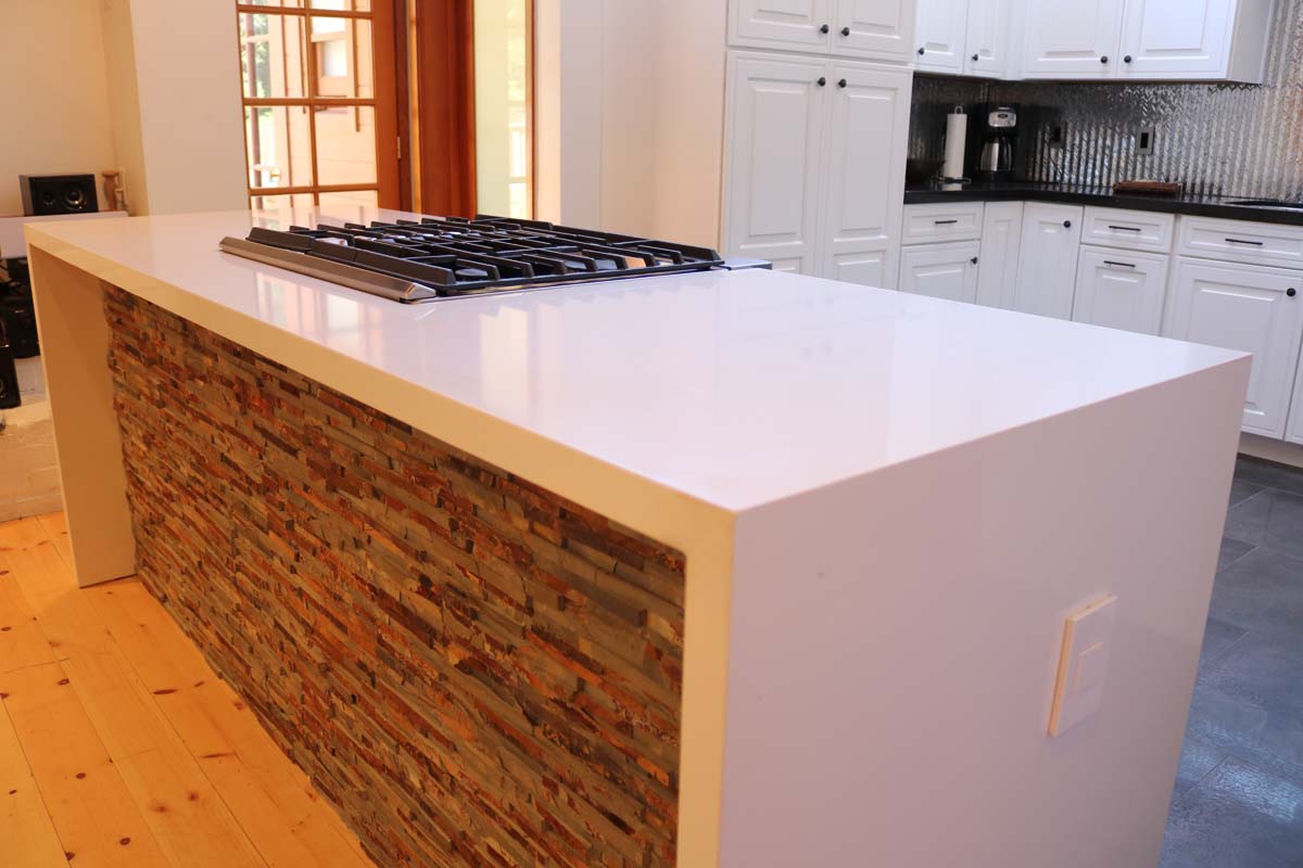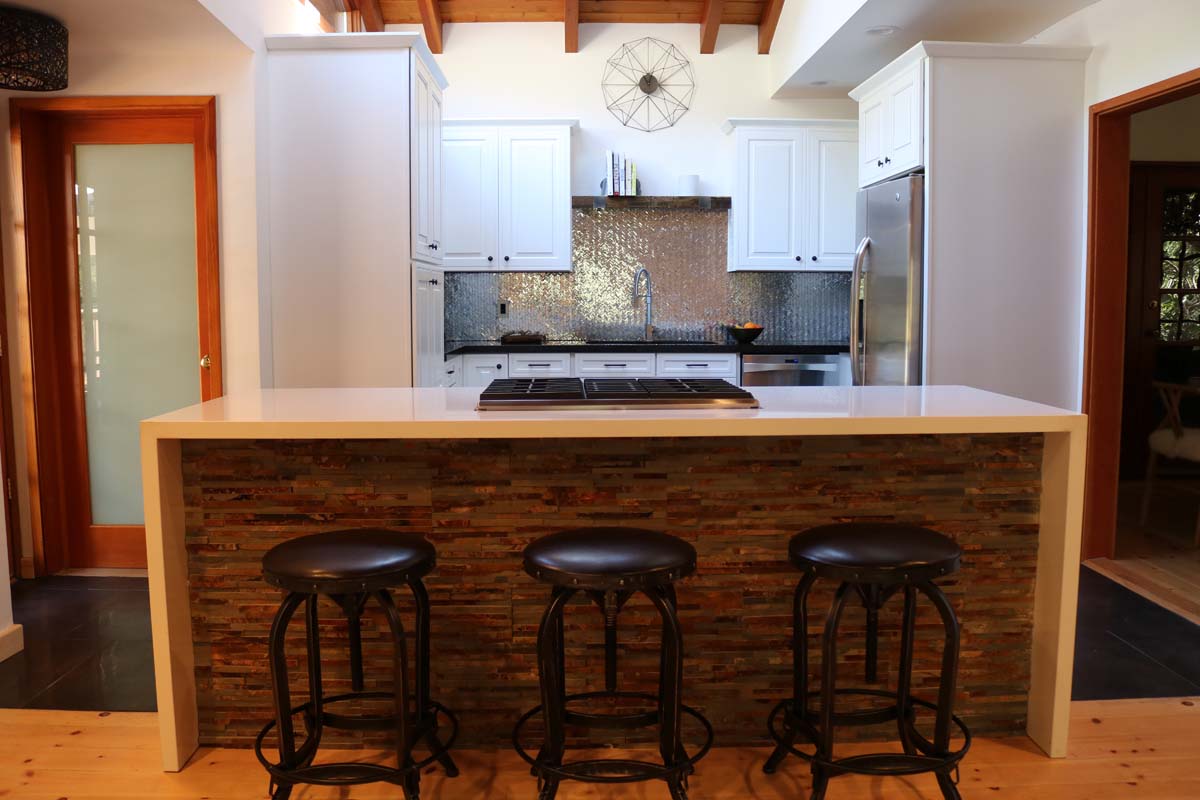Funky plywood woodwork and outdated ceramic tiles were replaced with fresh white cabinets, quartz countertops, dark stone flooring, a mosaic tile backsplash and stainless steel appliances to create a contemporary industrial style that complements the existing interior architecture throughout this Topanga Canyon home. Additionally, the old bulky stove hood was replaced with downdraft ventilation for an open plan conducive to entertaining.