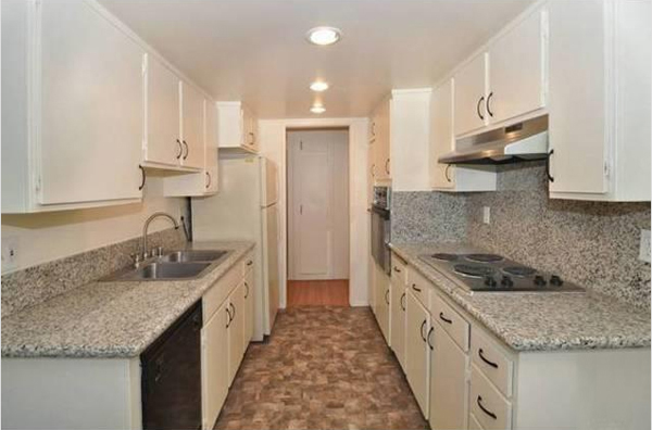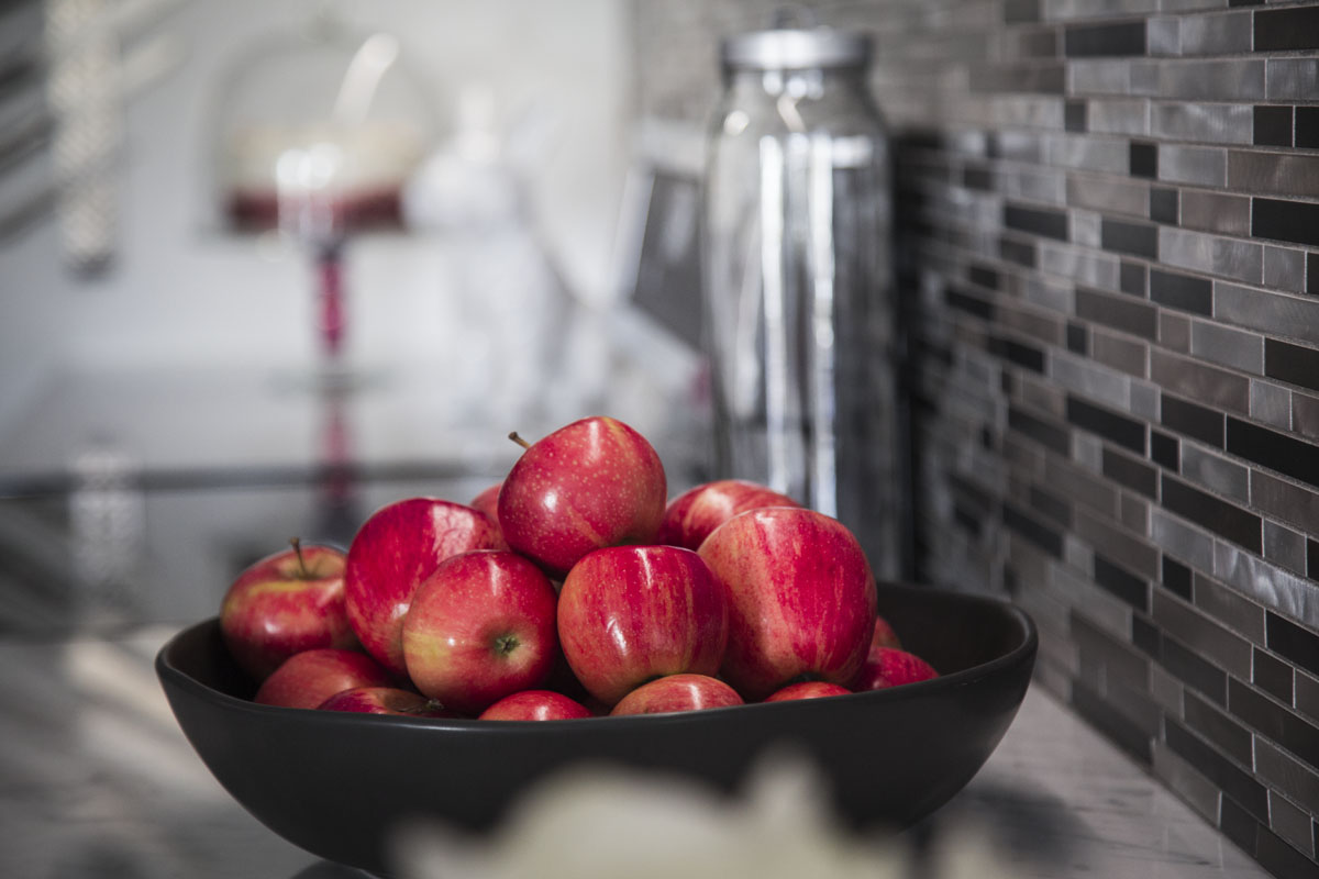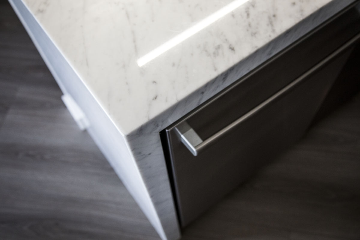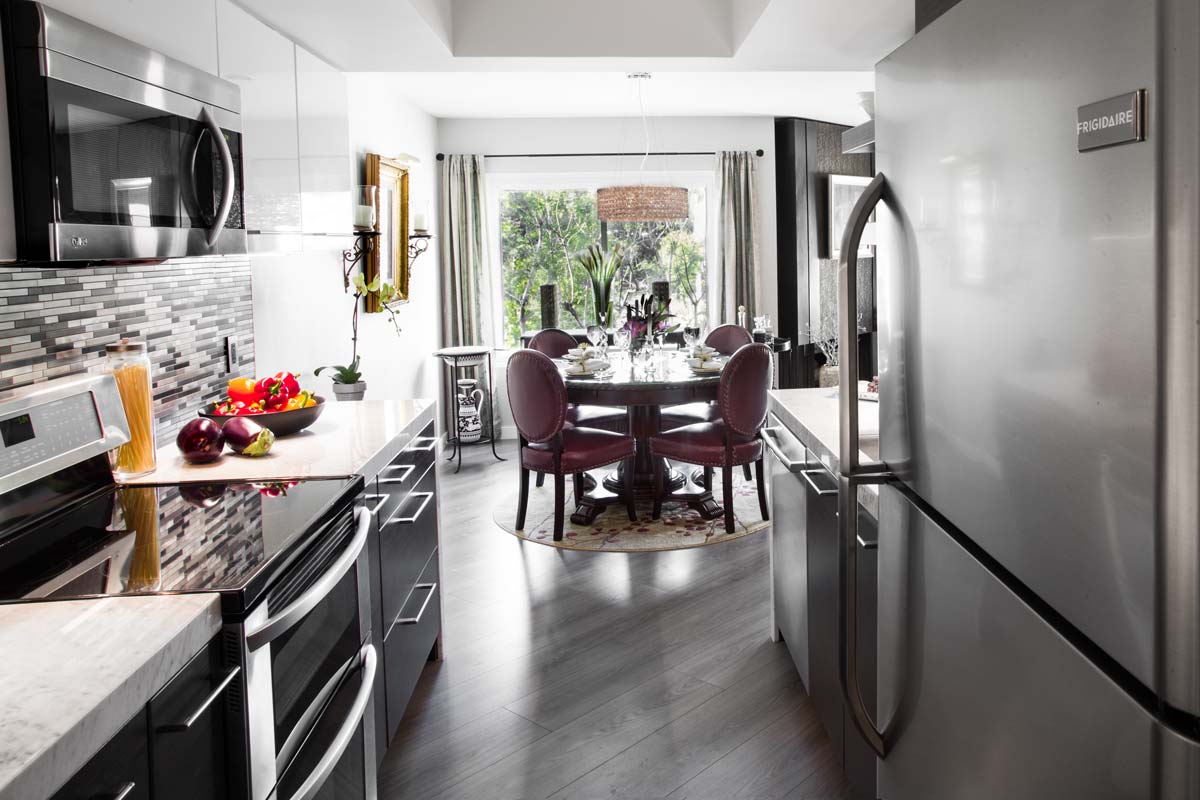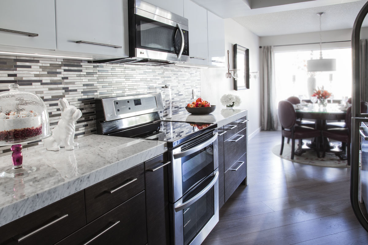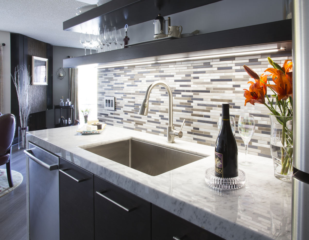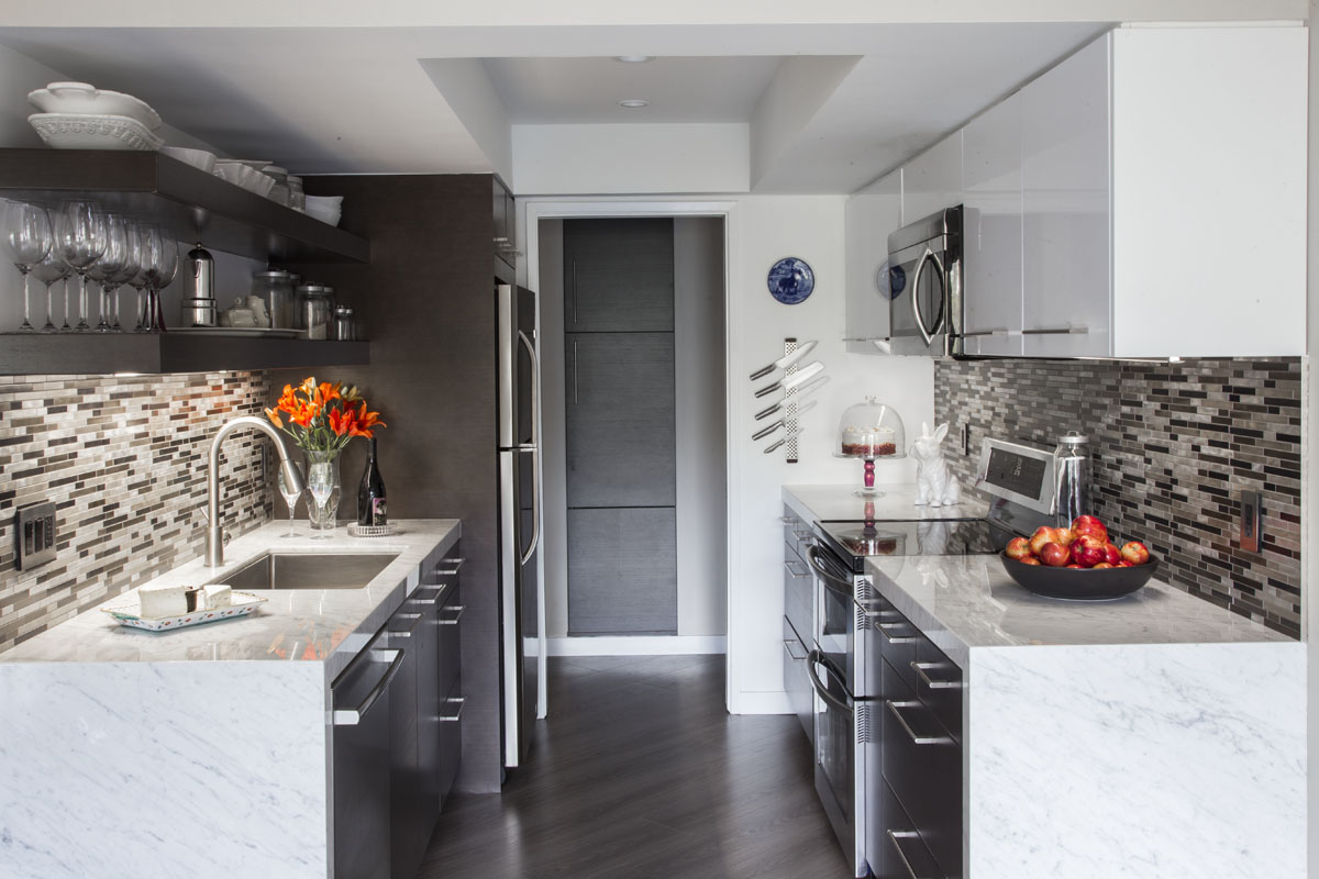 This 82-square-foot galley kitchen was configured for optimal form and function. Marble countertops cascade to waterfall edges that open up to the dining room. Stainless steel appliances, metal mosaic backsplashes, open shelving, LED lighting, chocolate brown and glossy white cabinets complete this contemporary design. The entire kitchen was finished in seven weeks for under $30,000 which included design, furnishings, materials and construction.