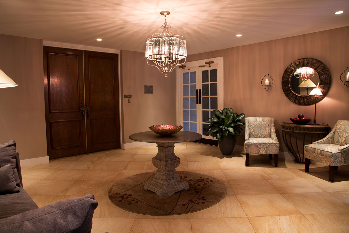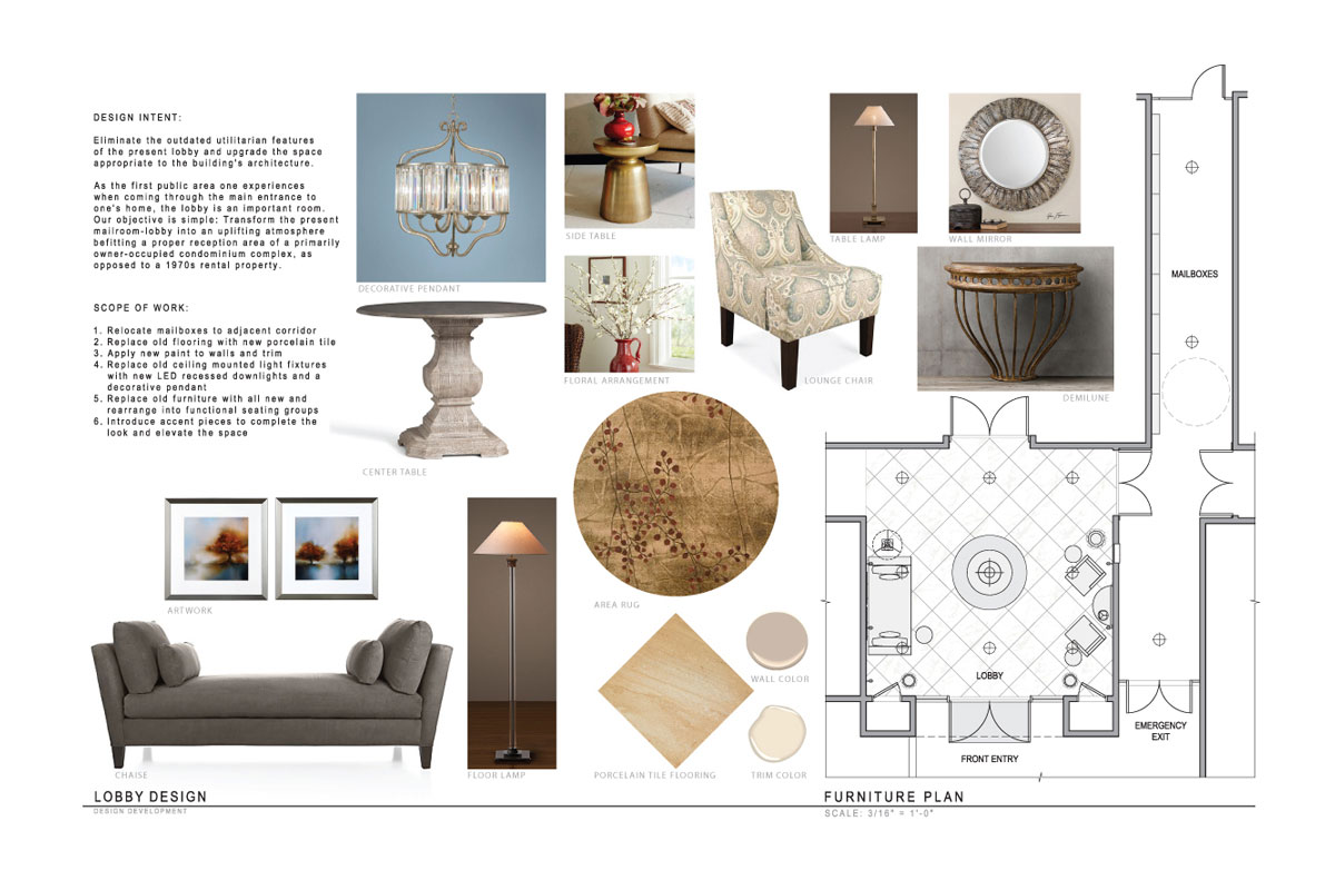 To transform this condominium lobby into an uplifting reception area, Gallego Design worked with the architect, contractor, city hall, fire department, postmaster and board of directors to relocate mailboxes and ensure everything was up to code. Effective collaboration with a diverse homeowners association was key to the success of this project.